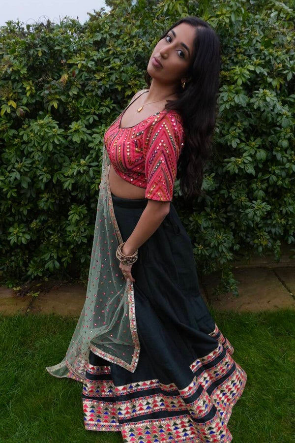 A vibrant pink embroidered blouse paired with a deep green lehenga skirt and a sheer embellished dupatta. The colorful border detailing adds a rich ethnic finish, making this a standout look for bridal festivities and cultural celebrations.